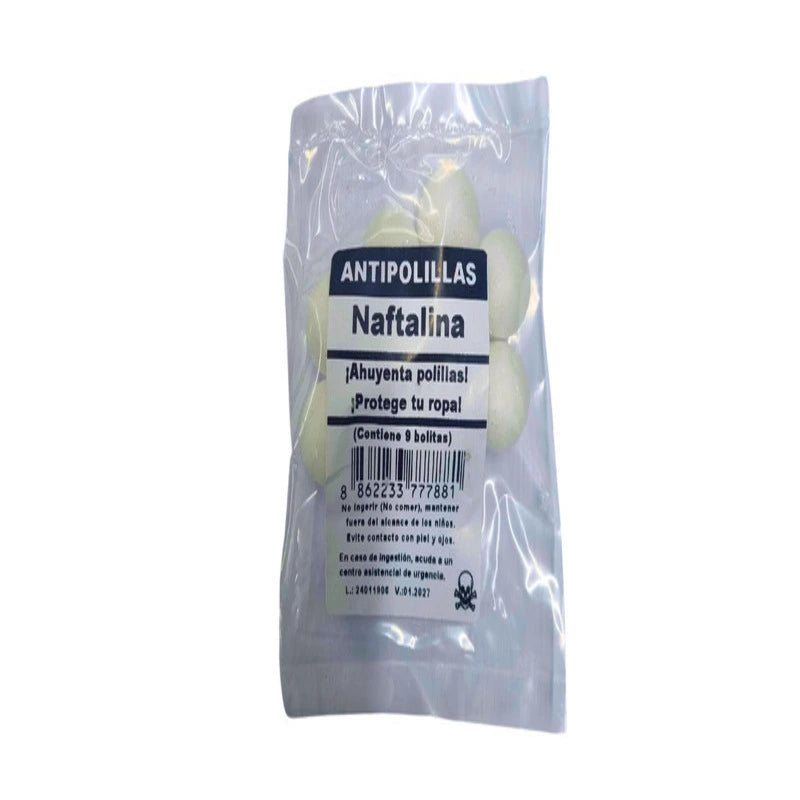 Naftalina en presentación de 9 bolitas, ideal para proteger prendas de vestir y textiles del daño causado por polillas y otros insectos. Su fórmula concentrada libera gradualmente vapores repelentes que mantienen la ropa segura durante el almacenamiento prolongado. Perfecta para guardarropas, armarios y espacios cerrados. Fácil de usar: simplemente distribuye las bolitas entre las prendas. Producto confiable para preservar la integridad de tus textiles durante todo el año.